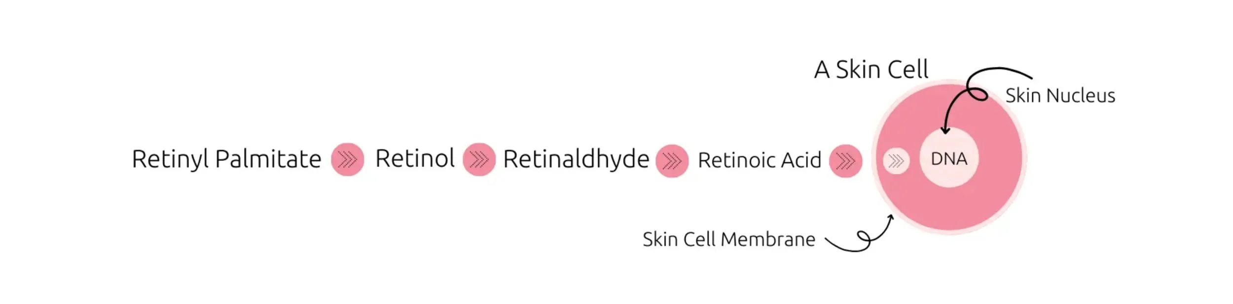 Retinyl palmitate is a gentle form of vitamin A. When you apply it to your skin, your body slowly converts it into retinol, then into retinaldehyde, and finally into retinoic acid—which is the active form, that actually works on your skin.